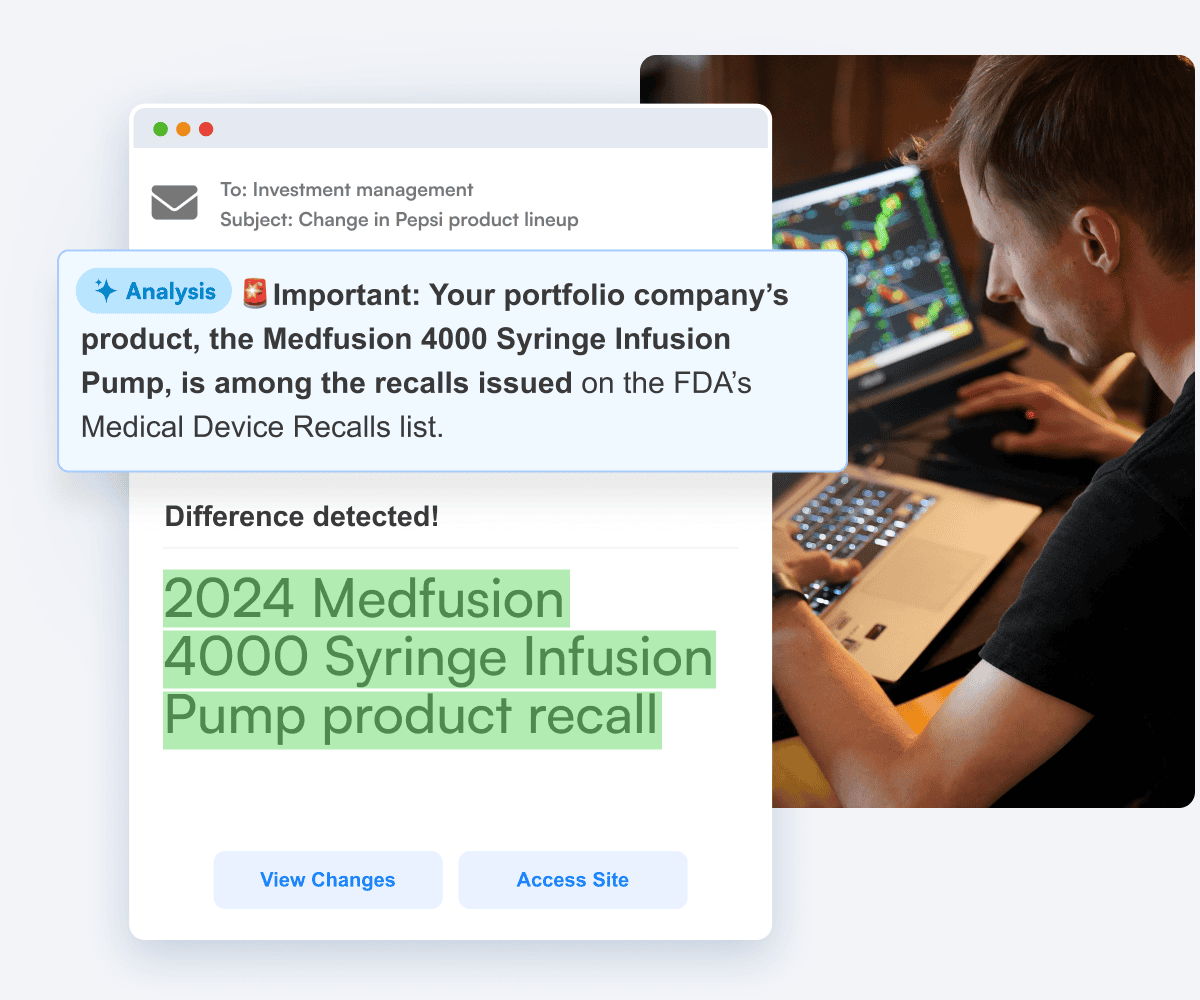 Use Visualping to keep an eye on your portfolio companies. Watch for executive team changes, disclosures, and more.